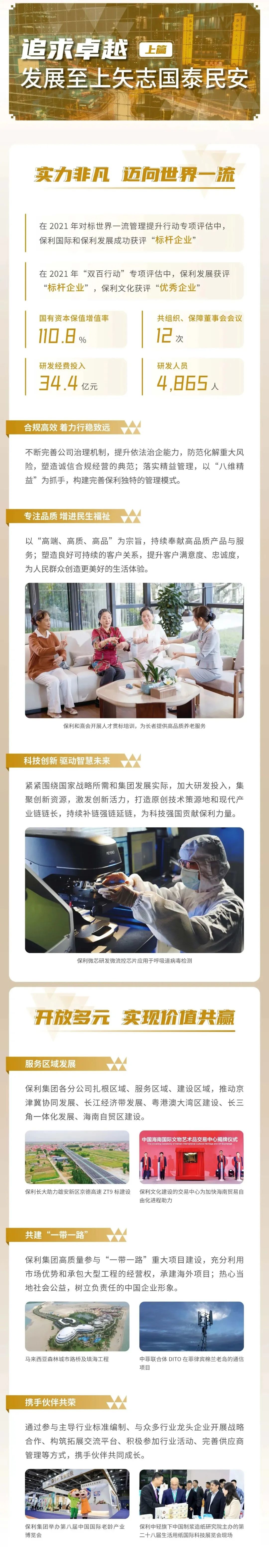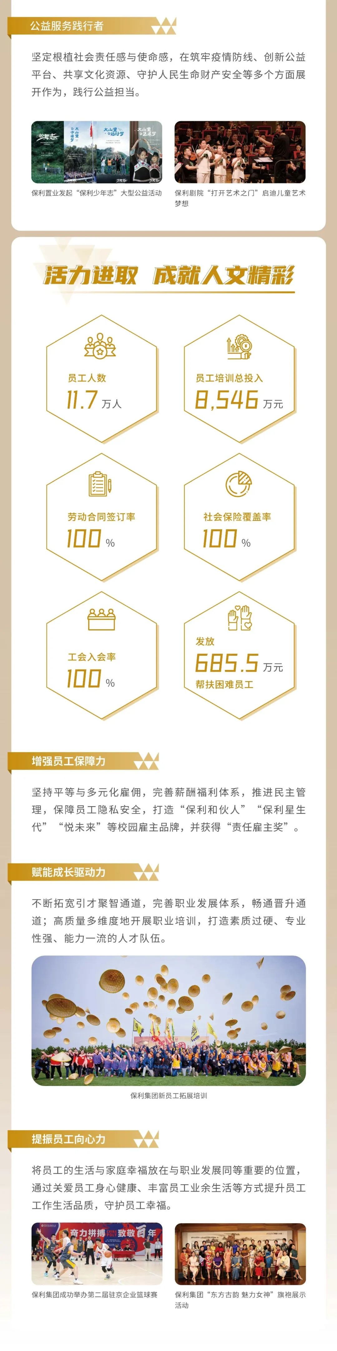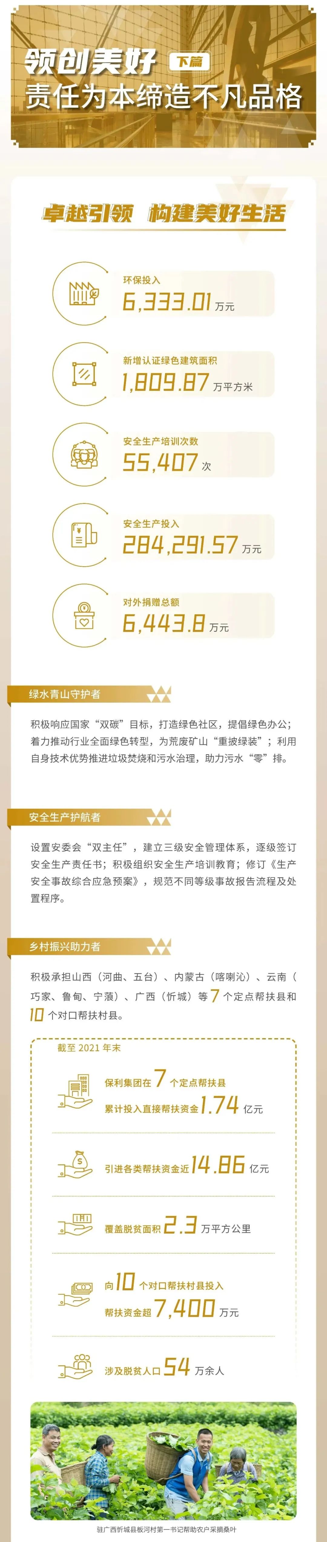 近日(ri),保利集團(tuan)公(gong)開發布2021社會(hui)責(ze)任報告,連續第(di)九次面(mian)向社會(hui)展現保利責(ze)任擔當(dang)。報告解讀了2021年保利集團(tuan)在服(fu)務國家(jia)發展大局、加快產業(ye)協同合(he)作、健全企業(ye)經營機(ji)制、守護綠(lv)水青山、保障社會(hui)民生、助力員工(gong)成長等方(fang)面(mian)的(de)貢(gong)獻,回顧(gu)了保利人奮(fen)發有為、勇毅擔當(dang)的(de)履責(ze)之路。