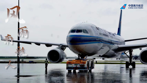 深圳寶安國際機(ji)場(chang),南航集團機(ji)務人員在雨中(zhong)放(fang)行飛機(ji)。