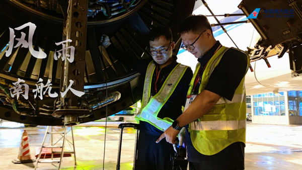 在貴陽(yang)機(ji)場(chang),南(nan)航集團機(ji)務人員冒雨進行孔探(tan)檢查,保障飛機(ji)安全平穩運行。