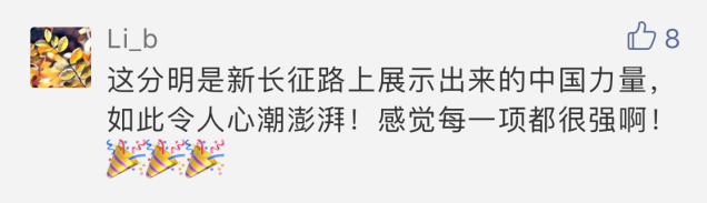 網友@Li_b:這分明是新長征路(lu)上展示出來(lai)的中國力量,如此令(ling)人心潮澎湃(pai)!感覺每一項都很強啊(a)!