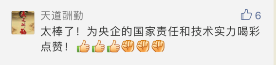 網友@天(tian)道酬(chou)勤(qin):太棒(bang)了!為(wei)央企的國(guo)家責任和(he)技術(shu)實(shi)力喝彩(cai)點贊(zan)!