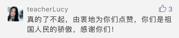 網友@teacherLucy:真(zhen)的(de)了不(bu)起,由(you)衷地為(wei)你(ni)們(men)點贊,你(ni)們(men)是祖(zu)國人民的(de)驕傲,感謝你(ni)們(men)!
