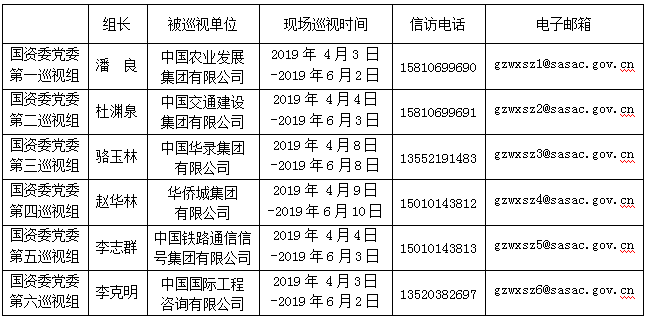 國資委黨(dang)委2019年第一輪(lun)巡視進駐一覽(lan)表