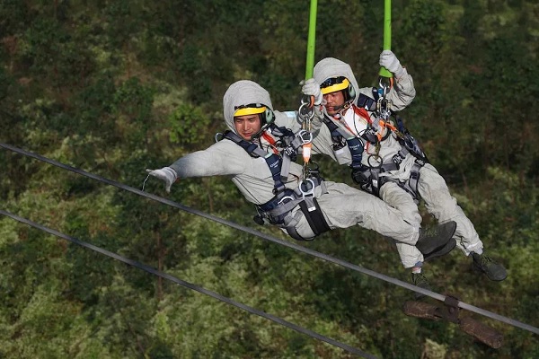 廣東輸變電開展國內首次直升機帶導線X光檢測作業時,帶電作業隊員靠近電場瞬間。(楊惠平 攝)