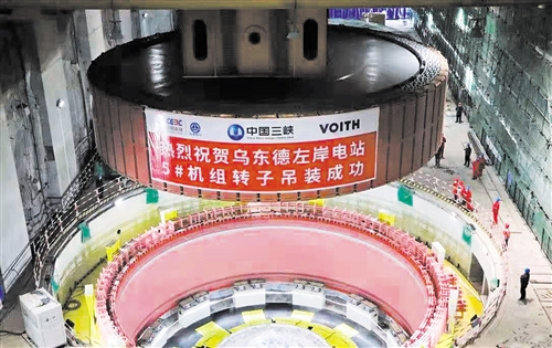 圖為烏東德左岸地下電站5號機組轉子吊裝成功。