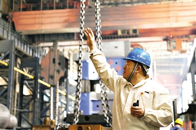 在中(zhong)國一重(zhong)鑄鍛(duan)鋼事業部水(shui)壓(ya)機鍛(duan)造(zao)廠車間(jian)里,一臺(tai)數十米高的萬噸級水(shui)壓(ya)機正在加工(gong)一個被燒得(de)紅彤(tong)彤(tong)的大(da)型工(gong)件(jian)。附近(jin)的操作臺(tai)上,劉伯(bo)鳴正仔細觀(guan)察著(zhu)(zhu)工(gong)件(jian)的形(xing)變狀況,不(bu)時(shi)變換著(zhu)(zhu)指揮手勢。他是(shi)中(zhong)國一重(zhong)首(shou)席技能大(da)師,也是(shi)全國技術能手、黑龍(long)江省勞動模范(fan)。