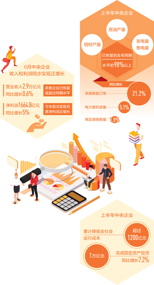 6月(yue)(yue)份,中(zhong)央企業更是實現營業收入和(he)凈(jing)利(li)潤(run)雙(shuang)雙(shuang)正(zheng)增(zeng)(zeng)長(chang)(chang)。其中(zhong)營業收入2.9萬億(yi)(yi)元(yuan),同(tong)比增(zeng)(zeng)長(chang)(chang)0.6%,多數企業已經(jing)恢復或超(chao)過同(tong)期水(shui)平;凈(jing)利(li)潤(run)1664.8億(yi)(yi)元(yuan),較(jiao)5月(yue)(yue)份增(zeng)(zeng)加646.3億(yi)(yi)元(yuan),同(tong)比增(zeng)(zeng)長(chang)(chang)5%,也是今(jin)年以來首次實現月(yue)(yue)度凈(jing)利(li)潤(run)正(zheng)增(zeng)(zeng)長(chang)(chang)。