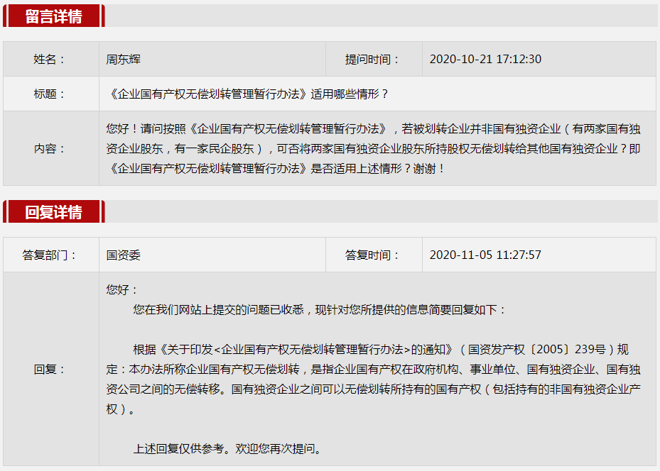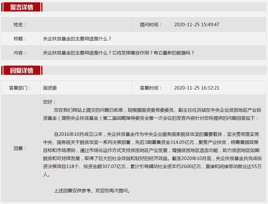 2020年11月國資委網站政務咨(zi)詢欄目部分(fen)網友提出的(de)咨(zi)詢,我(wo)們初步做出了認真的(de)回應,現選擇五條關(guan)注度高、點擊量高的(de)問題(ti),再次推薦分(fen)享。