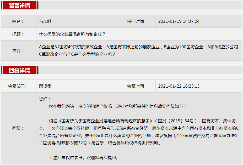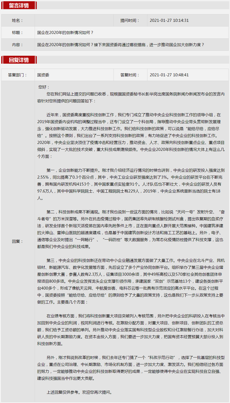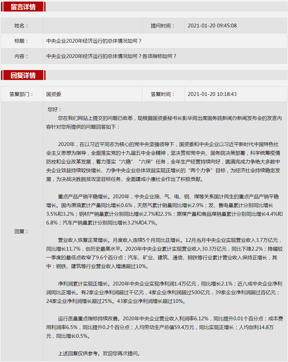 2021年1月(yue)國(guo)資(zi)委網(wang)站政務咨(zi)詢(xun)欄目部(bu)分(fen)(fen)網(wang)友提出的咨(zi)詢(xun),我們初步做出了認真的回應,現選擇(ze)五條關注度高、點擊(ji)量高的問題,再次推薦分(fen)(fen)享。