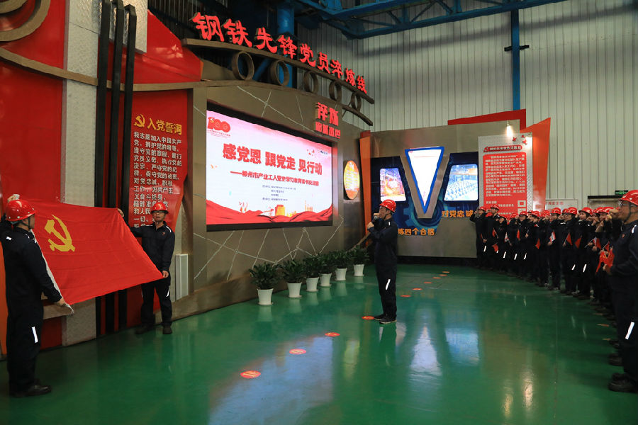 柳州市產業工人黨史學習教育讀書交流會在柳鋼集團舉行,圖為柳鋼集團基層黨員重溫入黨誓詞。