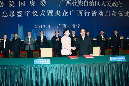 3月27日,國務院國資委與廣西壯族自治區人民政府在南寧舉行合作備忘錄簽字儀式暨“央企廣西行”活動啟動儀式,商定在“十二五”期間深入開展“央企廣西行”系列活動,共同推動中央企業與廣西的戰略合作。自治區黨委書記郭聲琨,自治區主席馬飚會見國務院國資委主任、黨委書記王勇一行。王勇和馬飚出席簽字暨啟動儀式并講話,國資委副主任黃丹華和自治區常務副主席黃道偉代表雙方簽署協議。自治區黨委副書記危朝安等領導,以及國資委副秘書長郭建新出席相關活動。