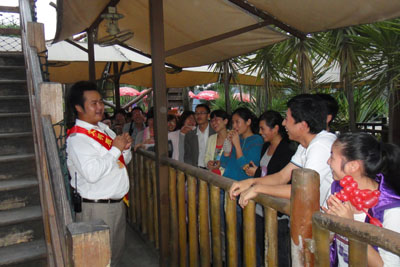 華僑城深圳歡樂谷導引員在為排隊等候的游客表演節目