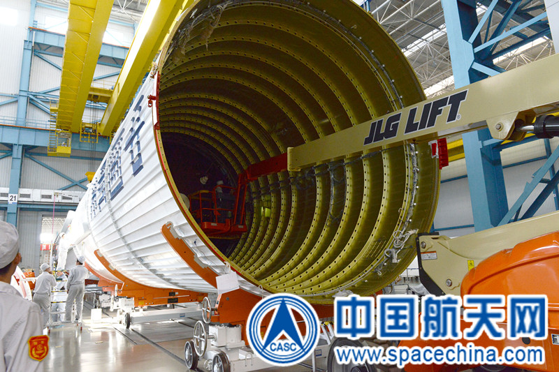 圖為(wei)航天科技(ji)集(ji)團一院211廠職工完成箭體的(de)最后總裝工作(zuo)
