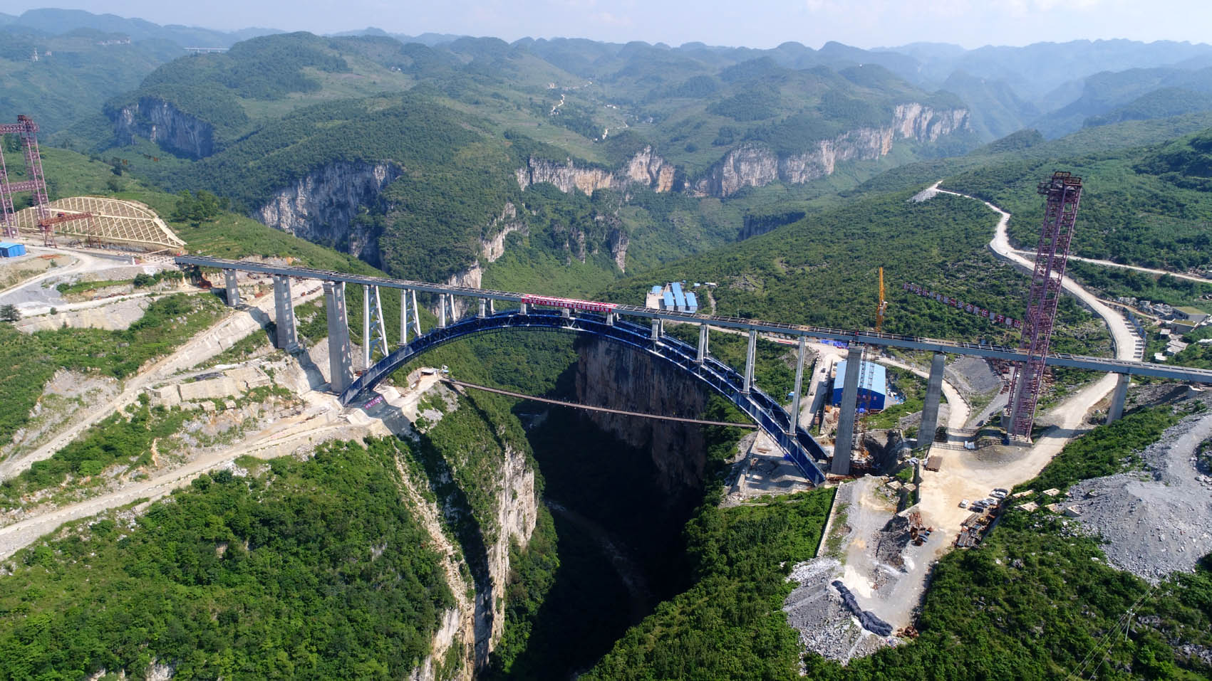 8月2日,中(zhong)國鐵建(jian)所屬中(zhong)鐵十八局集團(tuan)承建(jian)的(de)成貴鐵路西溪河大橋(qiao)主體建(jian)成。這座跨越(yue)260多米深(shen)谷(gu)、全(quan)長(chang)近500米、重(zhong)量超(chao)過2600噸的(de)“巨無(wu)霸”,是(shi)中(zhong)國高鐵首座鋼管混凝土轉體拱橋(qiao),其世界級技術難度和(he)風險(xian),在我(wo)國高鐵建(jian)橋(qiao)史上絕無(wu)僅有。