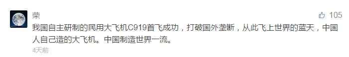 網友@榮:我國(guo)(guo)自主研制(zhi)的(de)民用大飛機C919首飛成功(gong),打破國(guo)(guo)外壟斷,從此(ci)飛上世(shi)(shi)界(jie)的(de)藍天(tian),中國(guo)(guo)人自己造的(de)大飛機。中國(guo)(guo)制(zhi)造世(shi)(shi)界(jie)一(yi)流(liu)。