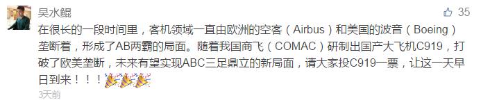網友@吳水(shui)鯤(kun):在很長的一段時間(jian)里,客機(ji)領(ling)域(yu)一直由歐洲(zhou)的空客(Airbus)和(he)美國(guo)的波音(Boeing)壟(long)斷著,形成了AB兩霸的局面。隨(sui)著我國(guo)商飛(fei)(COMAC)研制出國(guo)產大(da)飛(fei)機(ji)C919,打(da)破了歐美壟(long)斷,未來有望實現(xian)ABC三足鼎立的新局面,請大(da)家投C919一票,讓(rang)這一天早(zao)日到(dao)來!!!