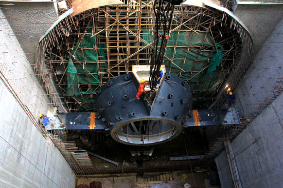 中鐵(tie)二十局建設者吊裝發電機組管(guan)型座內環