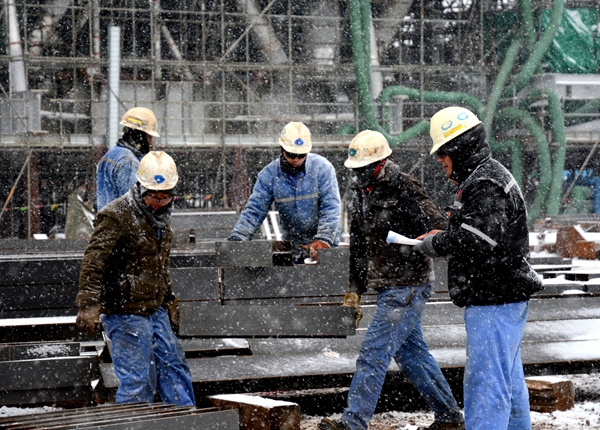 2015年(nian)11月24日,青島突降(jiang)大雪,為了保證(zheng)施(shi)工(gong)(gong)進度,施(shi)工(gong)(gong)人員冒著風(feng)雪嚴寒對優先使用的工(gong)(gong)字梁進行挑選分類