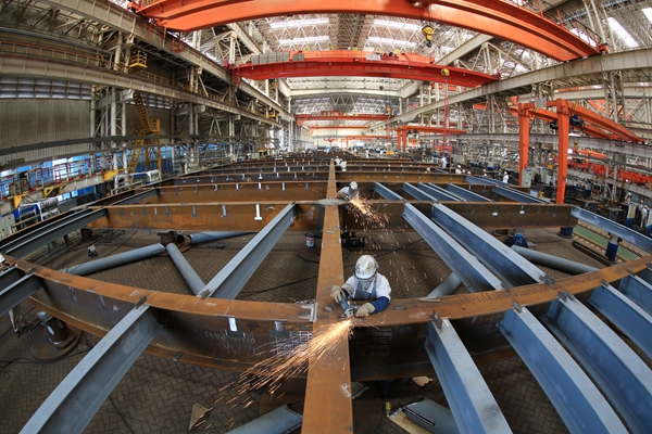 施工人員(yuan)正在對即將進行(xing)組裝(zhuang)的甲板(ban)片噴涂防腐材(cai)料