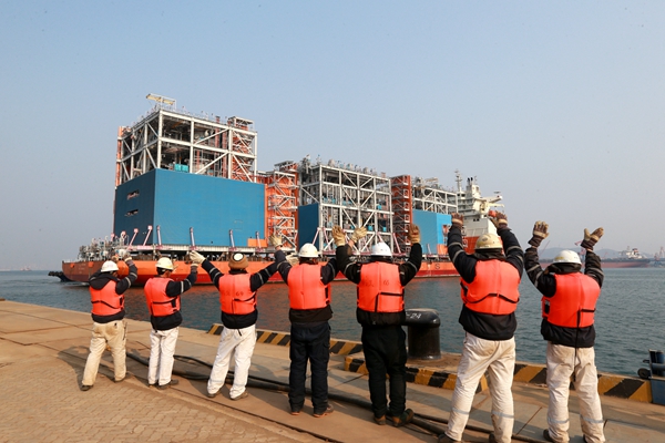 施(shi)工人員向先行裝(zhuang)船的模塊(kuai)(kuai)告(gao)別(bie),這(zhe)些(xie)模塊(kuai)(kuai)已經成為他們(men)最親(qin)密(mi)的戰友