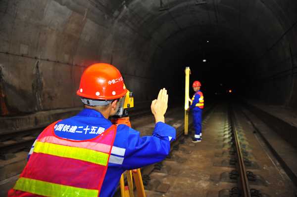 天窗(chuang)間(jian)隙,測(ce)量人員進(jin)入(ru)高鐵隧道(dao)進(jin)行沉降量精測(ce)
