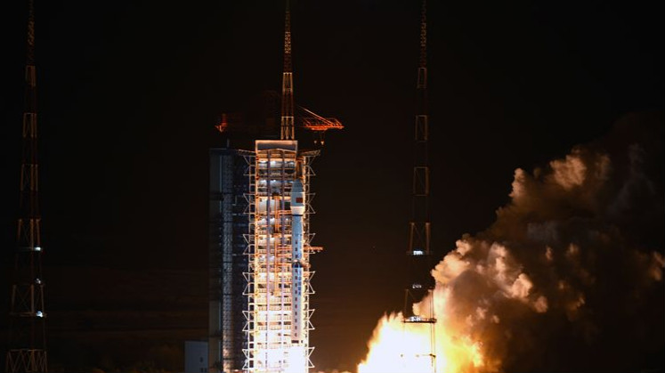 夜幕里,長四丙火箭點火后噴發出耀眼的火焰