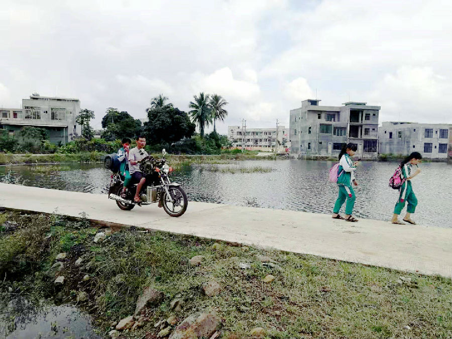 10月17日,早(zao)上(shang)七點的(de)(de)陽光溫柔穿過椰林,灑在海(hai)南省定(ding)安(an)縣龍河鎮(zhen)安(an)良村去(qu)上(shang)學的(de)(de)孩子們身上(shang)。只見,孩子們三(san)五成(cheng)群(qun),背著(zhu)(zhu)書包,滿心歡(huan)喜地走(zou)在去(qu)學校的(de)(de)路上(shang)。他(ta)們的(de)(de)腳下(xia),一條寬2米(mi),離地面(mian)80厘米(mi)高的(de)(de)水泥路一直向前延伸。路的(de)(de)兩邊是兩個小池塘(tang),水面(mian)倒映(ying)著(zhu)(zhu)藍天(tian)白(bai)云和周(zhou)圍居民樓(lou),煞是好看。