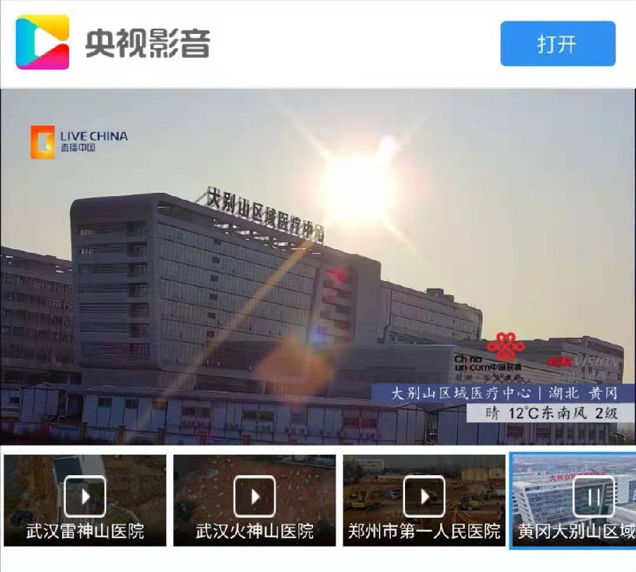 根據1月(yue)31日(ri)16時最新消息(xi),黃岡(gang)大別山醫院(yuan)(yuan)的獨家(jia)實時高(gao)清直播(bo)也(ye)在央(yang)視視頻(pin)APP上線。至此(ci),中國聯通已上線了“武(wu)(wu)漢火神山”“武(wu)(wu)漢雷(lei)神山”“鄭州市第一人民醫院(yuan)(yuan)”“黃岡(gang)大別山”四座醫院(yuan)(yuan)直播(bo)。