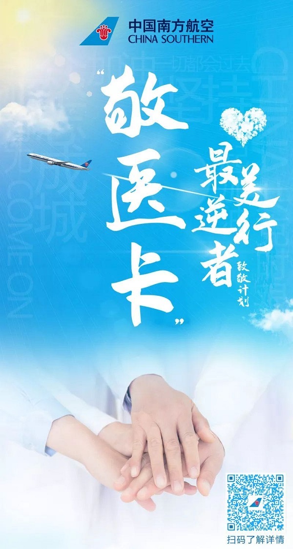為(wei)感謝奮戰在(zai)抗“疫”一線的(de)醫(yi)務工(gong)作(zuo)者(zhe),南(nan)航推(tui)出(chu)(chu)“最美逆行(xing)者(zhe)致(zhi)敬(jing)計(ji)劃”,首次(ci)面向在(zai)職醫(yi)護人員推(tui)出(chu)(chu)“敬(jing)醫(yi)卡”。推(tui)出(chu)(chu)“溫暖與(yu)共·客戶關懷計(ji)劃”,為(wei)旅客提供金銀卡延(yan)期保級(ji)(ji)與(yu)優惠保級(ji)(ji)、普卡里程延(yan)期等(deng)服務。
