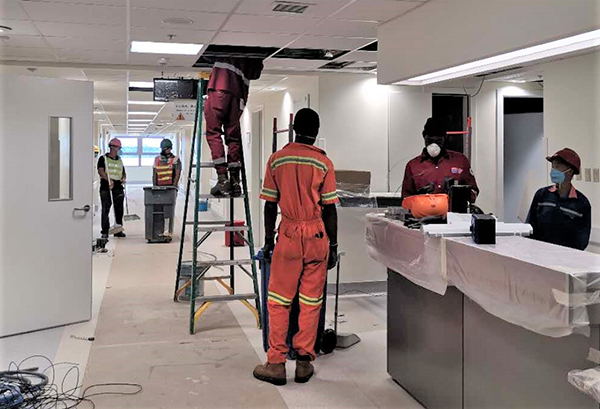 “在疫(yi)情期間實施(shi)搶工(gong),挑戰(zhan)比以往更大。但為(wei)了特多人(ren)(ren)民(min)的(de)(de)生命健康(kang)安全,我們(men)會像國內搶建(jian)火神山醫院(yuan)一(yi)樣(yang),擔起我們(men)的(de)(de)責任。”項(xiang)(xiang)目(mu)負責人(ren)(ren)李東生表(biao)示(shi),項(xiang)(xiang)目(mu)部既(ji)要迅速響應(ying)業主需求,還要控(kong)制施(shi)工(gong)人(ren)(ren)員密(mi)度,防止(zhi)出現交(jiao)(jiao)叉感染。項(xiang)(xiang)目(mu)部緊急召(zhao)開(kai)會議(yi),暫停其(qi)他區域(yu)施(shi)工(gong),協調多方資源,將其(qi)他區域(yu)床(chuang)位設備(bei)轉移到(dao)指定(ding)區域(yu)。經過7天的(de)(de)緊張工(gong)作(zuo),當地(di)時間3月(yue)24日,所(suo)有病房床(chuang)位和(he)設備(bei)已(yi)移交(jiao)(jiao)給業主。