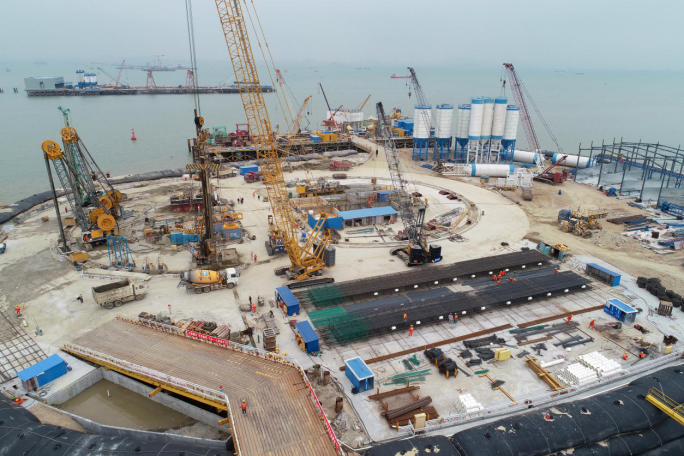 南方電網廣東中山供電局黨員服務隊隊員,到達深中通道項目S05工程合同段項目部負責的伶仃洋大橋西索塔建設現場,圖為西索塔建設工程的航拍一角。孫嘉彪 攝