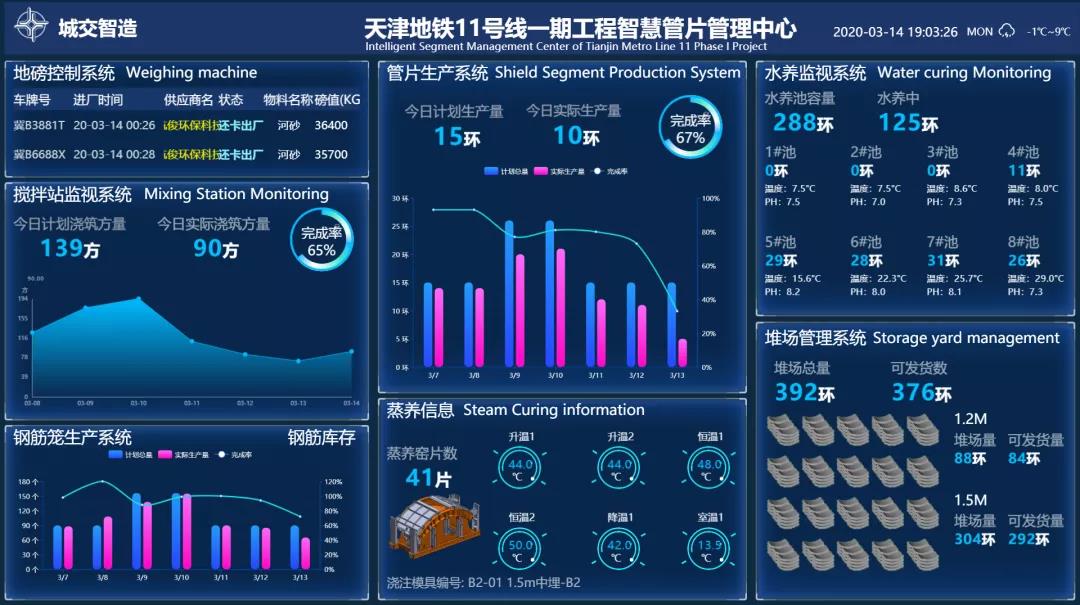 這(zhe)還(huan)只(zhi)是“智(zhi)慧工廠(chang)”的冰山一(yi)角。在(zai)車間內有一(yi)處全透明化智(zhi)慧管片(pian)系統管理中心,巨大(da)的電(dian)子屏展(zhan)示了各個工段(duan)的生產數據,現(xian)場人(ren)員、安(an)全、設備等動態數據清(qing)晰可(ke)見。