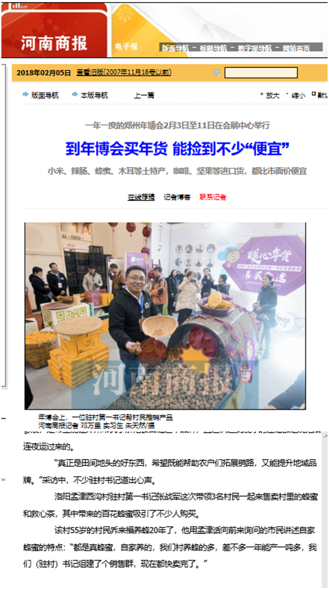 洛陽孟津西溝村駐(zhu)村第一書記張戰軍這(zhe)次帶領3名(ming)村民(min)一起來(lai)售賣村里的(de)蜂(feng)(feng)蜜和救心茶,其中帶來(lai)的(de)百花蜂(feng)(feng)蜜吸引了不少人購買。