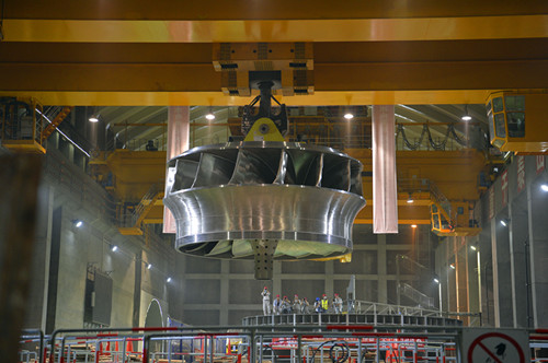 6月21日10時許,白鶴灘(tan)水電站左(zuo)岸1號(hao)機(ji)轉輪——全球首臺百萬(wan)千瓦水電機(ji)組“心臟”在(zai)1300噸(dun)橋機(ji)的(de)牽引下平穩上(shang)升(sheng),經過(guo)約300米的(de)水平移動,于11時許抵達1號(hao)機(ji)機(ji)坑(keng)正上(shang)方,隨后開始緩緩下降并成功就位(wei)。