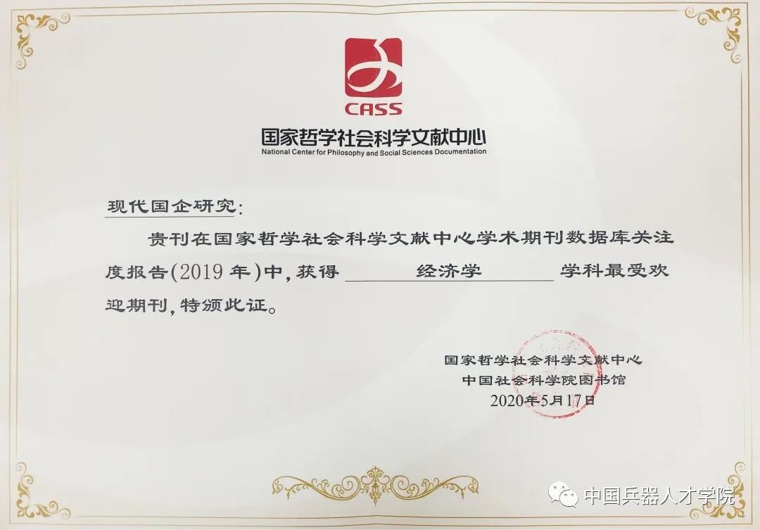 近(jin)日,國(guo)(guo)家哲學(xue)(xue)社(she)會(hui)科(ke)(ke)學(xue)(xue)文(wen)獻(xian)中(zhong)(zhong)心、中(zhong)(zhong)國(guo)(guo)社(she)會(hui)科(ke)(ke)學(xue)(xue)院(yuan)圖書館(guan)發布了《國(guo)(guo)家哲學(xue)(xue)社(she)會(hui)科(ke)(ke)學(xue)(xue)文(wen)獻(xian)中(zhong)(zhong)心學(xue)(xue)術期(qi)刊數據(ju)庫(ku)用戶(hu)關(guan)注(zhu)(zhu)度報(bao)告(2019年度)》。由中(zhong)(zhong)國(guo)(guo)兵器工業集團(tuan)(tuan)有(you)限公司主管,中(zhong)(zhong)國(guo)(guo)兵器工業集團(tuan)(tuan)人(ren)才研究(jiu)中(zhong)(zhong)心主辦的《現代國(guo)(guo)企研究(jiu)》雜志榮獲經(jing)濟學(xue)(xue)學(xue)(xue)科(ke)(ke)最(zui)受歡迎期(qi)刊(前25位(wei))第20位(wei),在“學(xue)(xue)習強國(guo)(guo)”平臺最(zui)受關(guan)注(zhu)(zhu)期(qi)刊排名中(zhong)(zhong)(前10位(wei))位(wei)列(lie)第7。