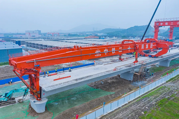在南(nan)沿江城際鐵路中鐵二(er)十二(er)局集團(tuan)江陰東制梁場施工現場,全(quan)新研制的千噸(dun)級分體(ti)式架橋機、過隧運梁車通力(li)協作,穩穩地架設成功一榀長40米、重達近1000噸(dun)的高(gao)鐵箱梁。