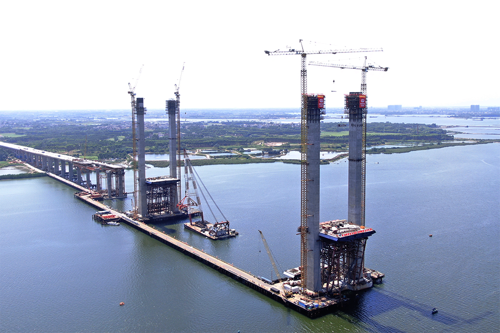 由于大橋為(wei)跨海(hai)大橋,為(wei)確(que)(que)保(bao)(bao)工(gong)(gong)(gong)(gong)(gong)程(cheng)質(zhi)量,主(zhu)(zhu)塔(ta)(ta)(ta)采(cai)用(yong)(yong)與港珠澳大橋一樣的(de)(de)環氧鋼筋、C55海(hai)工(gong)(gong)(gong)(gong)(gong)高(gao)性能混(hun)凝(ning)(ning)土(tu),外(wai)表面(mian)均涂裝防腐(fu)(fu)材料(liao)。為(wei)減少環氧鋼筋在運輸過程(cheng)中損壞,項(xiang)目部(bu)專設(she)一間鋼筋加(jia)(jia)工(gong)(gong)(gong)(gong)(gong)廠,把加(jia)(jia)工(gong)(gong)(gong)(gong)(gong)環氧鋼筋的(de)(de)專家和(he)機械從中山(shan)“搬到”施(shi)(shi)(shi)工(gong)(gong)(gong)(gong)(gong)現(xian)場,現(xian)做現(xian)用(yong)(yong),確(que)(que)保(bao)(bao)大橋防腐(fu)(fu)標準(zhun)(zhun)滿足(zu)設(she)計要求。大橋主(zhu)(zhu)塔(ta)(ta)(ta)共(gong)分24節澆(jiao)筑,為(wei)了讓(rang)主(zhu)(zhu)塔(ta)(ta)(ta)快(kuai)速(su)(su)安全地“長高(gao)”,項(xiang)目部(bu)采(cai)用(yong)(yong)液壓爬模施(shi)(shi)(shi)工(gong)(gong)(gong)(gong)(gong)技(ji)(ji)術,合理布置大型(xing)塔(ta)(ta)(ta)吊;采(cai)用(yong)(yong)BIM技(ji)(ji)術進(jin)行仿真施(shi)(shi)(shi)工(gong)(gong)(gong)(gong)(gong)模擬,并通(tong)過測量精(jing)準(zhun)(zhun)定位、監(jian)控線型(xing)檢測技(ji)(ji)術、使用(yong)(yong)環氧鋼筋、混(hun)凝(ning)(ning)土(tu)摻加(jia)(jia)疏水化合孔(kong)栓物(wu)等新材料(liao)、新工(gong)(gong)(gong)(gong)(gong)藝(yi),確(que)(que)保(bao)(bao)了塔(ta)(ta)(ta)柱(zhu)的(de)(de)施(shi)(shi)(shi)工(gong)(gong)(gong)(gong)(gong)安全和(he)質(zhi)量;通(tong)過細化塔(ta)(ta)(ta)柱(zhu)施(shi)(shi)(shi)工(gong)(gong)(gong)(gong)(gong)責任矩陣,強化工(gong)(gong)(gong)(gong)(gong)序(xu)銜接,優化人力資源(yuan)配置,將原(yuan)本7天(tian)1節的(de)(de)速(su)(su)度提高(gao)至5天(tian)1節,確(que)(que)保(bao)(bao)了塔(ta)(ta)(ta)柱(zhu)施(shi)(shi)(shi)工(gong)(gong)(gong)(gong)(gong)進(jin)度。