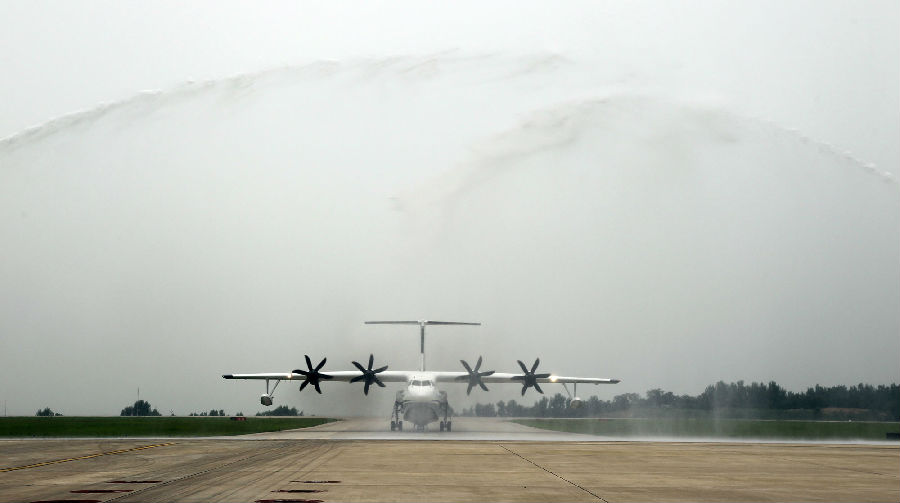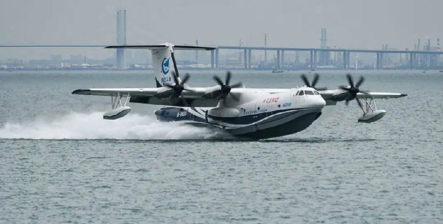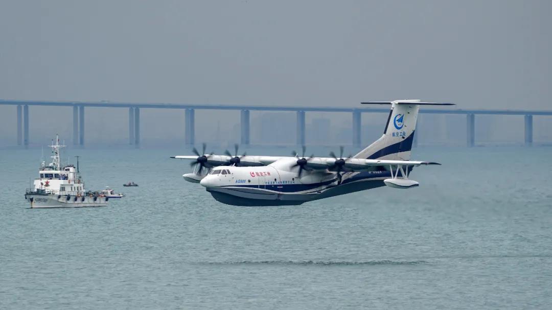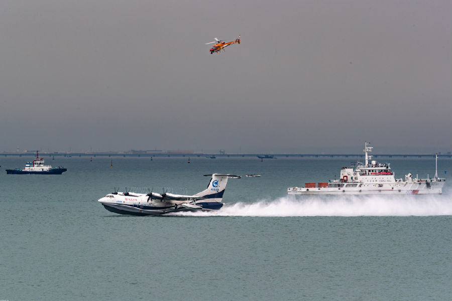 9時28分,由機(ji)長趙(zhao)生、副駕駛(shi)劉汝(ru)欽、機(ji)械師魏鵬和監控觀(guan)察員焦連躍組成(cheng)的首飛機(ji)組,按預定科(ke)目,駕駛(shi)AG600飛機(ji)從山(shan)東日照(zhao)山(shan)字河(he)機(ji)場滑(hua)行起飛,在空中飛行約(yue)28分鐘后順利抵達山(shan)東青島團(tuan)島附近海域。