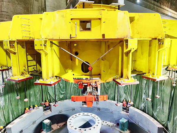 7月25日,烏東德水電站9號(hao)機組(zu)下機架順利(li)(li)吊(diao)入機坑(keng),為確保9號(hao)機組(zu)轉子順利(li)(li)吊(diao)裝(zhuang)又邁進了關鍵的一(yi)步(bu)。