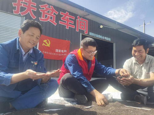 甘肅甘南供電公司駐村第一書記郝廣平(中)在扶貧車間與村干部一同工作