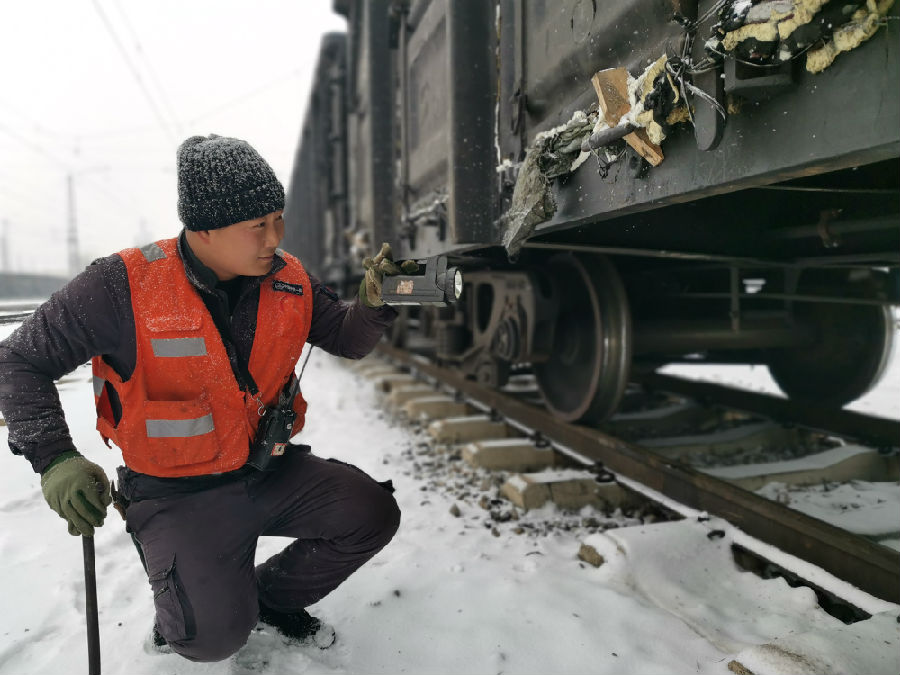 作為近年來(lai)最冷的(de)(de)(de)一個(ge)冬天(tian),全(quan)副武裝的(de)(de)(de)職工張志新早已習慣,棉(mian)(mian)衣棉(mian)(mian)褲棉(mian)(mian)鞋,脖套(tao)線(xian)帽皮手套(tao),披著一身(shen)(shen)戰甲(jia),在沒有風的(de)(de)(de)凌晨,還(huan)是(shi)凍的(de)(de)(de)瑟(se)(se)瑟(se)(se)發抖。“接車比較冷,一動不動地站著,待會(hui)檢(jian)修的(de)(de)(de)時候就渾(hun)身(shen)(shen)冒(mao)汗了。”等待接車的(de)(de)(de)間隙(xi),他說道。