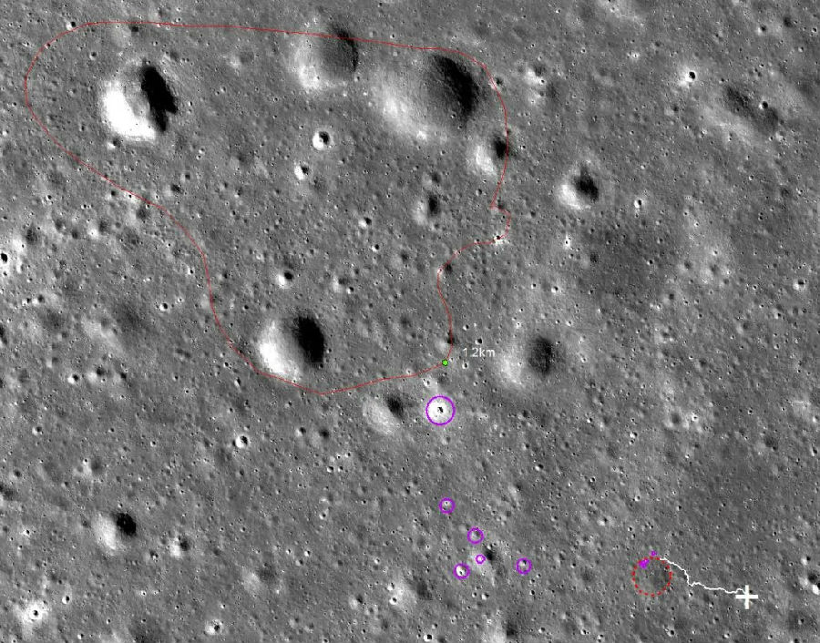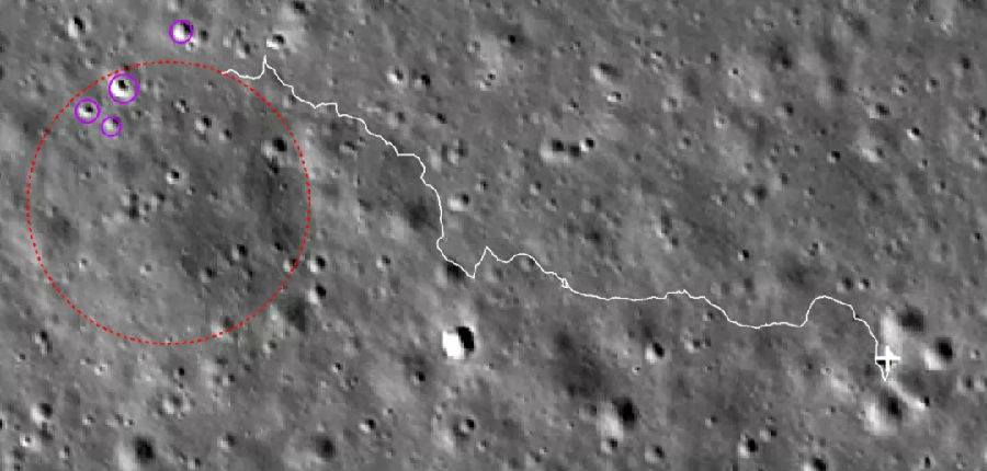 距離最近反射率較高的撞擊坑(紫色圓圈區域),虛線紅色圈為退化撞擊坑