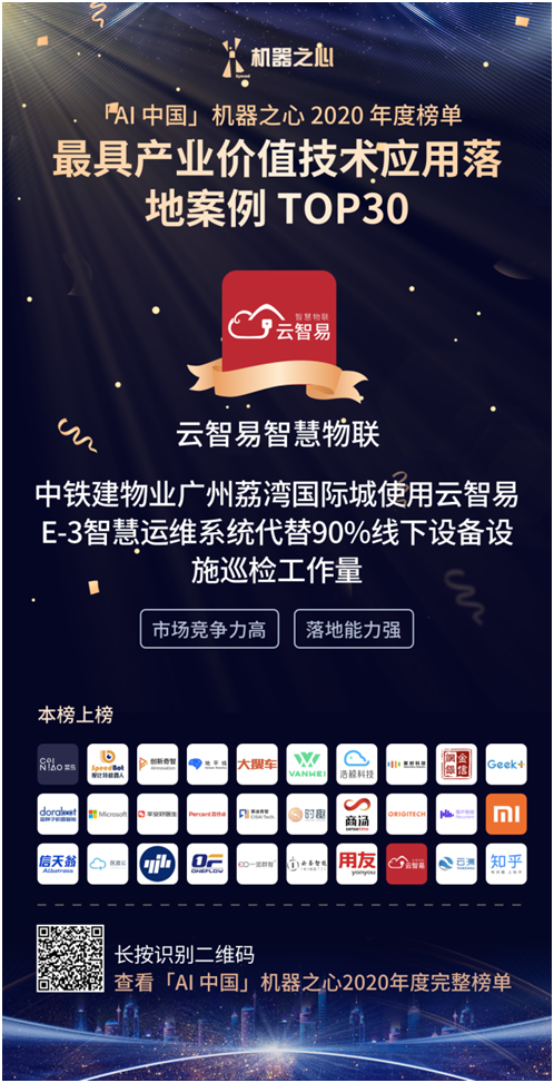 據了解,作(zuo)為(wei)目(mu)前國內人(ren)工智(zhi)(zhi)能(neng)界規模(mo)最(zui)大、評選最(zui)權(quan)威的(de)(de)年度獎項(xiang),機器之心年度獎項(xiang)已成為(wei)我國人(ren)工智(zhi)(zhi)能(neng)產業的(de)(de)風向(xiang)標。“最(zui)具產業價值技(ji)術應用落地案(an)(an)例(li)TOP30”榜單主(zhu)要(yao)關注近(jin)兩年落地實(shi)踐(jian)的(de)(de)數字化(hua)轉型、產業智(zhi)(zhi)能(neng)化(hua)升級案(an)(an)例(li)及相關成果,其獲獎案(an)(an)例(li)均為(wei)所處行業的(de)(de)標桿項(xiang)目(mu)。此次中鐵(tie)建物業廣州荔灣國際(ji)城(cheng)智(zhi)(zhi)慧社(she)區(qu)項(xiang)目(mu)榮登榜單,為(wei)行業智(zhi)(zhi)慧社(she)區(qu)建設(she)提供(gong)了一份可借鑒的(de)(de)案(an)(an)例(li)樣本。