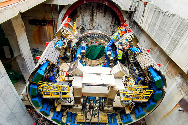 中鐵十(shi)四(si)局項目(mu)負責人馮(feng)國偉介紹(shao),盾(dun)構(gou)機將(jiang)面臨長距(ju)離、大(da)埋深、高(gao)水壓(ya)(ya)、地質(zhi)復雜(za)等施工(gong)難題(ti),涉及9種軟硬不(bu)同(tong)的(de)地層,最大(da)埋深63米、巖石最大(da)強(qiang)度(du)達105兆帕,同(tong)時還(huan)將(jiang)下穿建設(she)中的(de)深中通道(dao)、深圳機場航(hang)站(zhan)樓值班宿舍樓等眾多高(gao)難度(du)風險(xian)源(yuan)。為(wei)適(shi)應(ying)長距(ju)離海底復雜(za)地層掘進,項目(mu)部成立盾(dun)構(gou)專(zhuan)家組,開展關(guan)鍵技術攻(gong)關(guan),通過(guo)優化刀(dao)盤、刀(dao)具配置,并選用“主(zhu)動(dong)鉸接”與穩定器結合設(she)計,進一步提高(gao)了硬巖地層刀(dao)具更換效率和盾(dun)構(gou)機應(ying)對(dui)高(gao)水土壓(ya)(ya)力(li)的(de)性能,確保了施工(gong)安全可控(kong)。