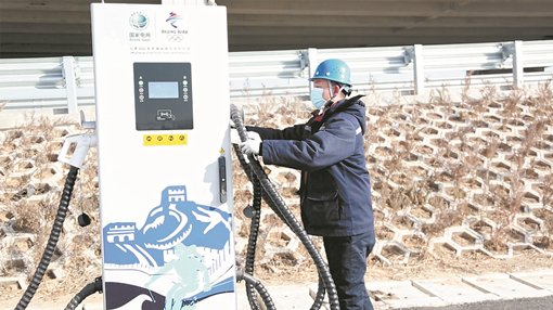 國網北京電力員工維護冬奧交通樞紐站阪泉服務區充電樁。