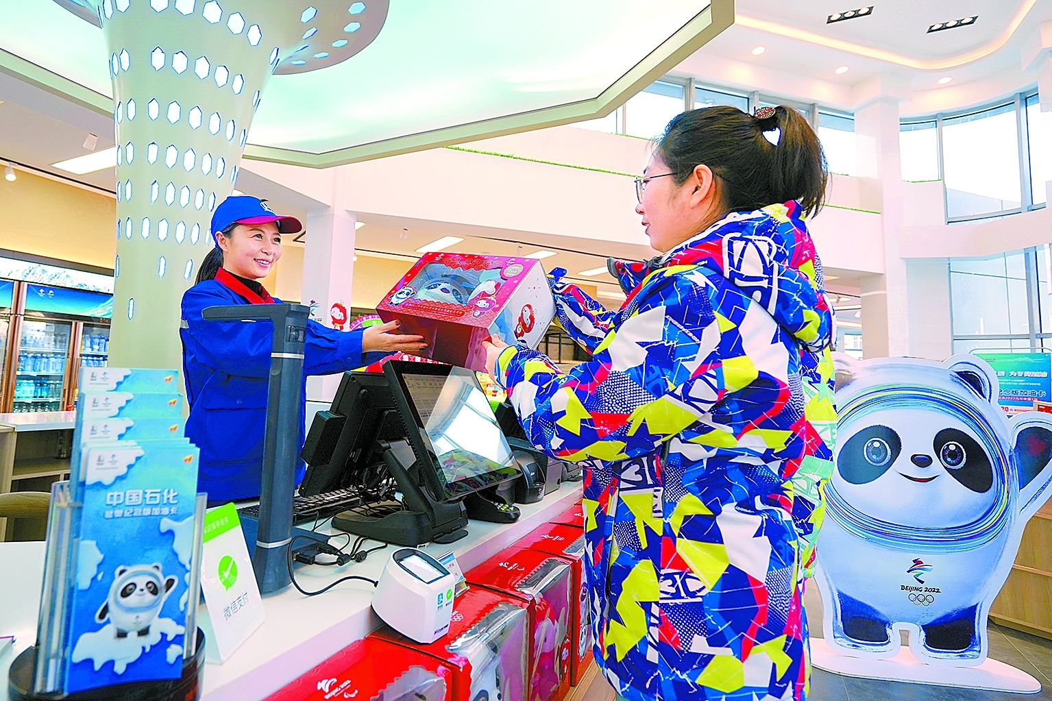 這座距離(li)北京冬(dong)(dong)奧(ao)會(hui)核心賽區云頂滑雪(xue)場只有十分鐘車程的加(jia)(jia)油(you)站,到處(chu)裝(zhuang)扮著冬(dong)(dong)奧(ao)元素,客戶走進油(you)站,除了加(jia)(jia)到最(zui)優(you)質的油(you)品,還可以選購到各種各樣具有冬(dong)(dong)奧(ao)特(te)色與文(wen)化內涵(han)的冬(dong)(dong)奧(ao)特(te)許商品。冬(dong)(dong)奧(ao)吉祥物“冰(bing)墩(dun)(dun)墩(dun)(dun)”“雪(xue)容融”毛絨玩具、印有冬(dong)(dong)奧(ao)標志的各種文(wen)具、擺件和飾品琳瑯滿目。