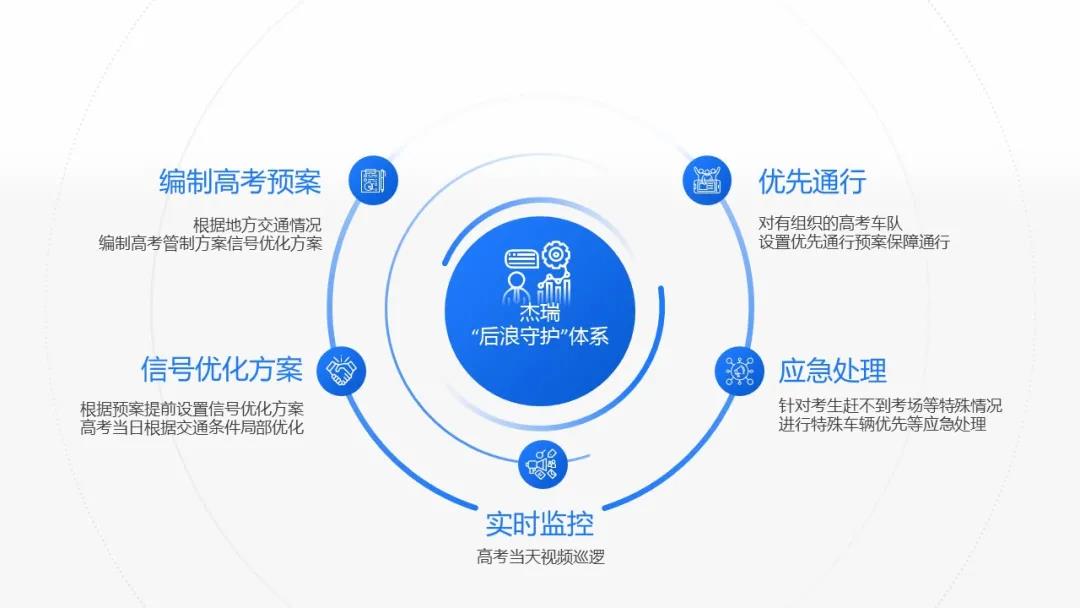 “后浪(lang)出行守(shou)護(hu)”體系(xi)依托“杰瑞智慧交通綜合(he)管控平(ping)臺”,融合(he)視頻、信號燈、多(duo)源傳感(gan)器、勤務車輛等信息科技(ji)資源,建立(li)了一套包含預案編(bian)制、交通信號優化、實(shi)(shi)時監控、應急處理(li)、優先通行五大模(mo)塊的(de)全流程守(shou)護(hu)機制,對高考活動(dong)全面(mian)覆蓋,實(shi)(shi)現全流程守(shou)護(hu)。
