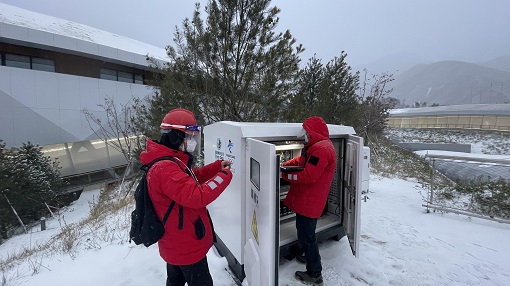 國家雪車雪橇場館電力保障團隊隊員在場館巡視電力設備。