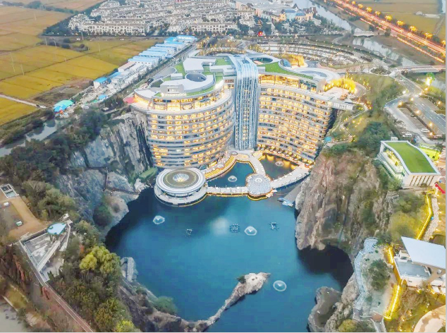 在上海佘山,中建八局變廢為寶,在深達80米的廢棄采石坑內,建造了世界海拔最低的五星級酒店——上海佘山世茂深坑酒店。