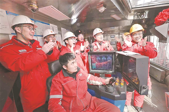 深地塔科1井鉆探深度突破10000米時,司鉆房內的技術人員激動地歡呼,鼓掌慶祝。